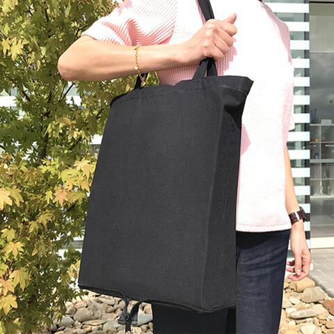 Environmental friendly calico bag with long handles so it can be carried on shoulder it is made of 170gsm cotton and can be folded and zipped into a small wallet size.