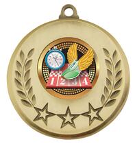 The Budget Heavyweight series offers prestige antique gold medals for a range of sports and activities at great value. The Running medal - applicable for track and athletics events - features a detailed design that celebrates a running shoe with a stop-watch background.
