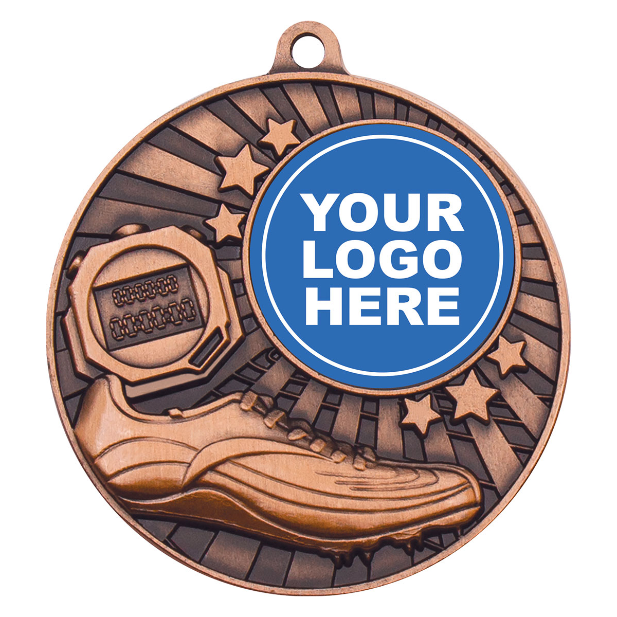 Brilliant athletics medals features iconic elements of track shoe and stop-watch while retaining central space for your custom logo to celebrate your club.