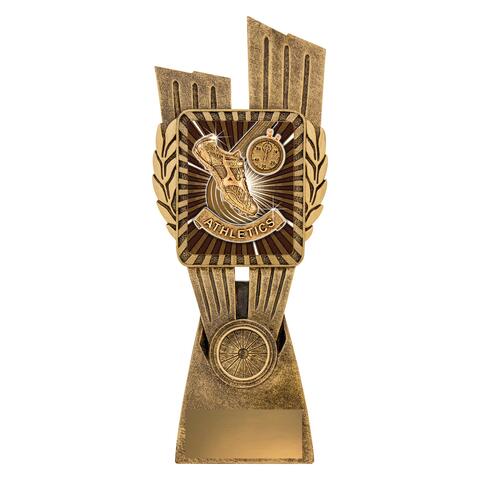 Antique Gold Lynx trophy features a classic wreath design and vibrant athletics theme. These athletics trophies offer the option of including your custom logo over various sizes.