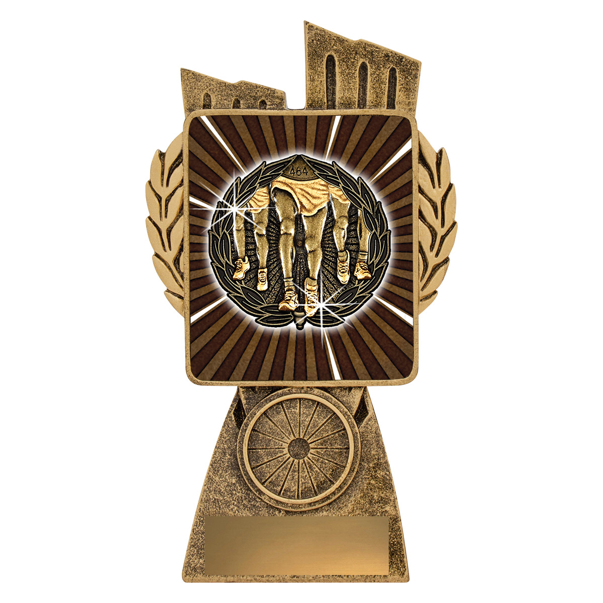 Antique Gold Lynx trophy features a classic wreath design and vibrant theme. These running trophies offer the option of including your custom logo over various sizes.