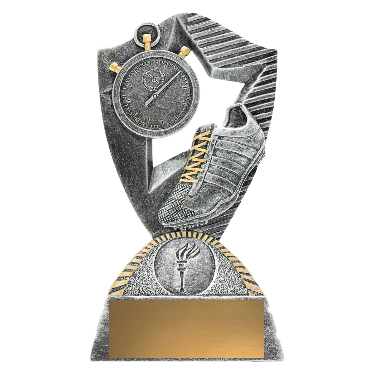 Brilliant athletics trophy with running shoe and stop-watch suits various track events. The Gambit offers a dynamic theme in antique silver & gold - space for your custom logo.