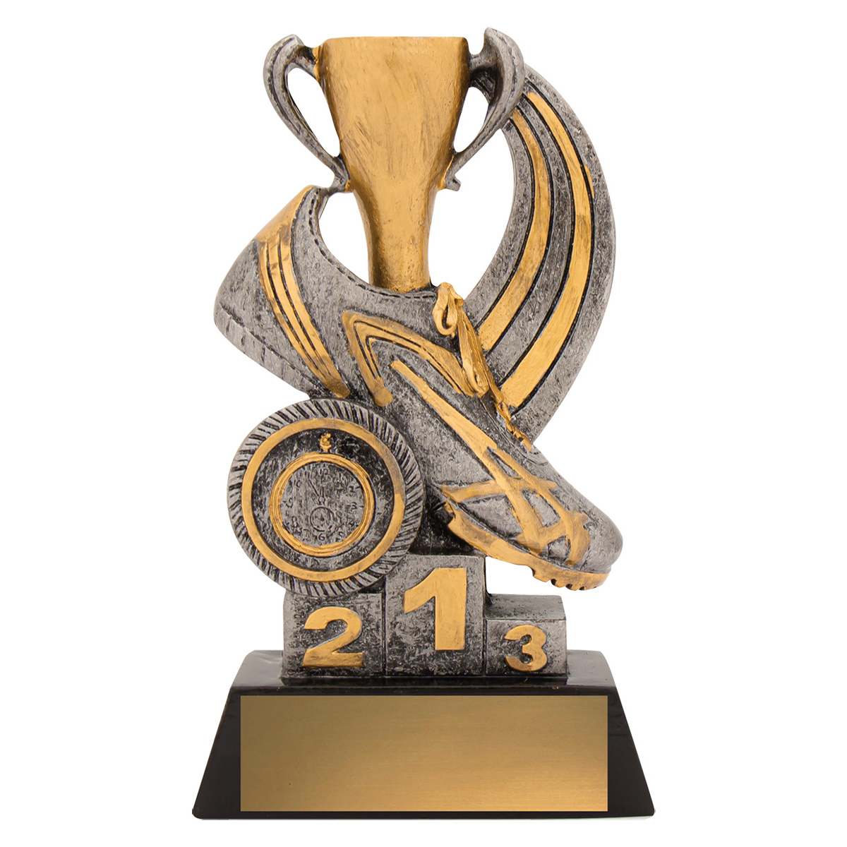 The Athletics Podium trophy presents a budget option with an appealing design of iconic track elements and finished in classic antique silver.