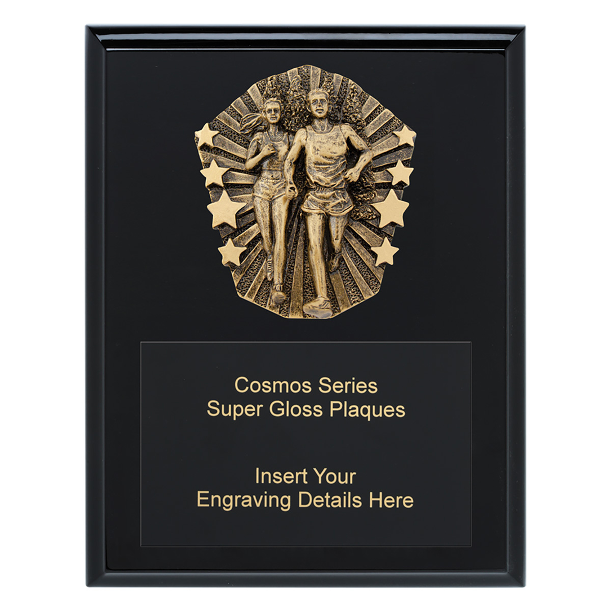 Range of super gloss plaques in classic black with brilliant Cosmos fronts and matte black engraving. Choose plaque - available in 3 sizes - to suit your sport or activity.