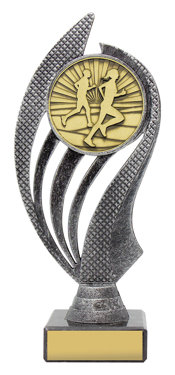 Husky series of trophies on premium black marble allows for different award options for your activity. Appealing antique silver and gold combination over number of sizes.