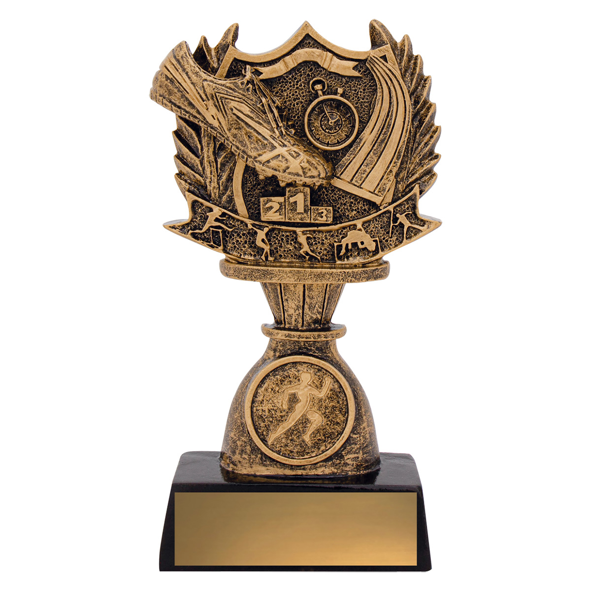 Classic shield design featuring track & field elements and running shoe. This budget style trophy series is available in 3 convenient sizes and contains space for the option of including your logo inserts if required.