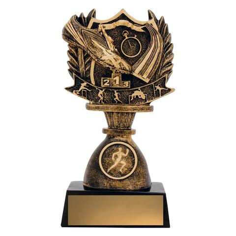 Classic shield design featuring track & field elements and running shoe. This budget style trophy series is available in 3 convenient sizes and contains space for the option of including your logo inserts if required.