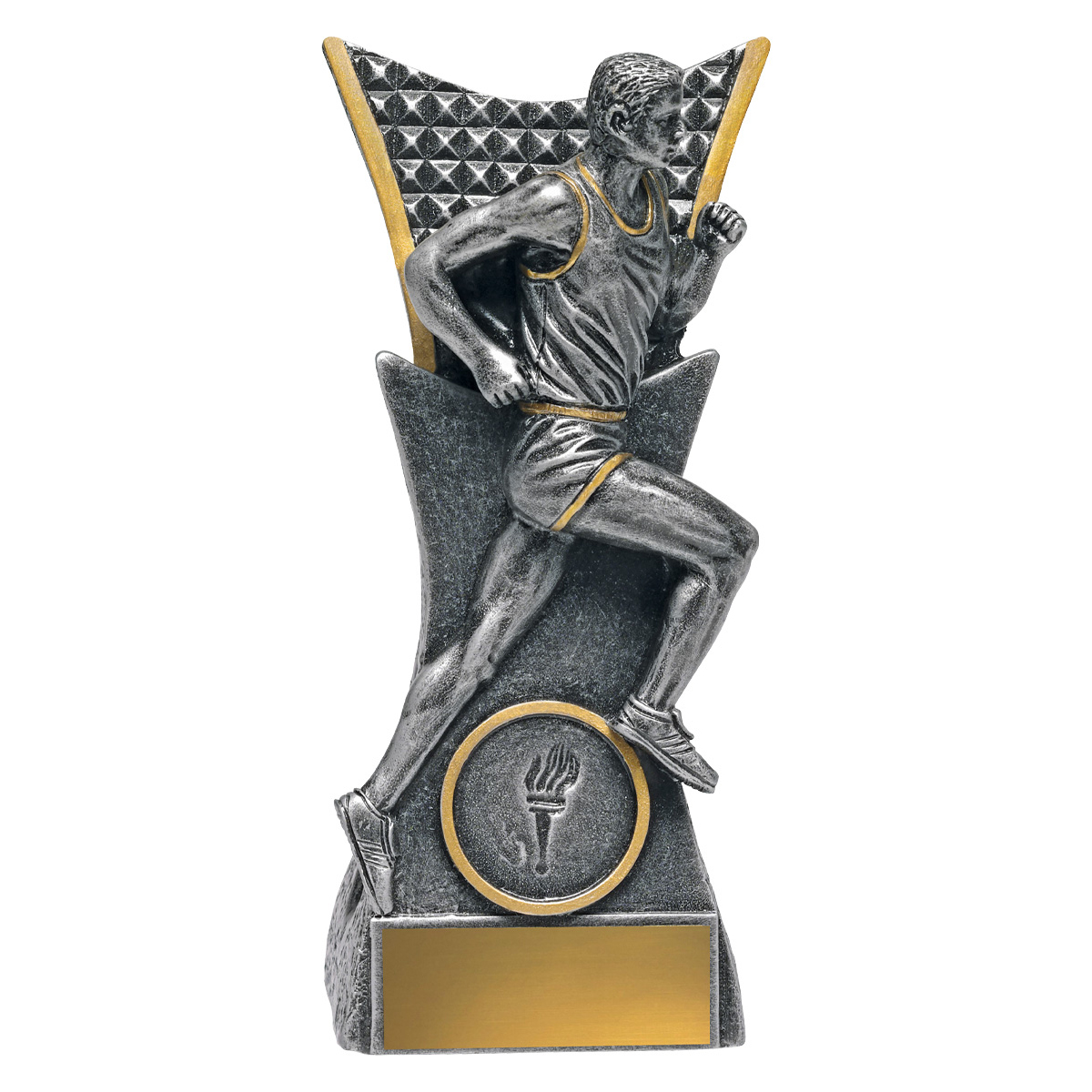 The Vanguard Trophy series, an innovative trophy design showcasing an athlete in motion. This track trophy is finished in silver & gold and available in 3 convenient and effective sizes.