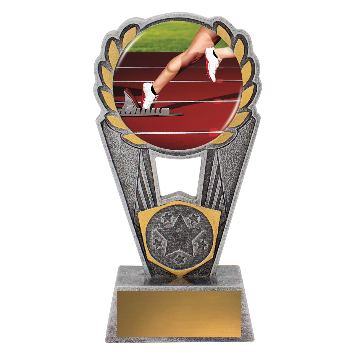 Polaris series offers a striking design of trophy with excellent options for personalisation. Trophies showcase a sprinting theme over a number of sizes. Space for your 25mm logo if required.