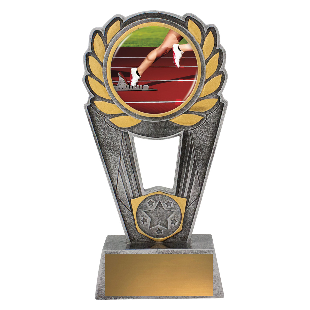 Polaris series offers a striking design of trophy with excellent options for personalisation. Trophies showcase a sprinting theme over a number of sizes. Space for your 25mm logo if required.