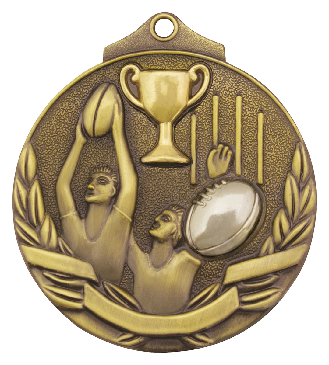 Classic antique medal featuring distinctive two-toned design. Medal a fantastic option to recognise the achievement of your footy team or club. Ribbons available in all colours and medal boxes to suit.