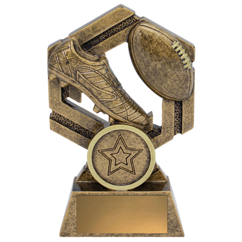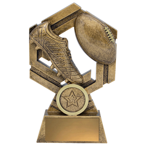 Eye-catching design that features classic Aussie Rules elements of boot and ball. Footy trophies finished in traditional antique gold. Available in 3 sizes with space for custom insert.