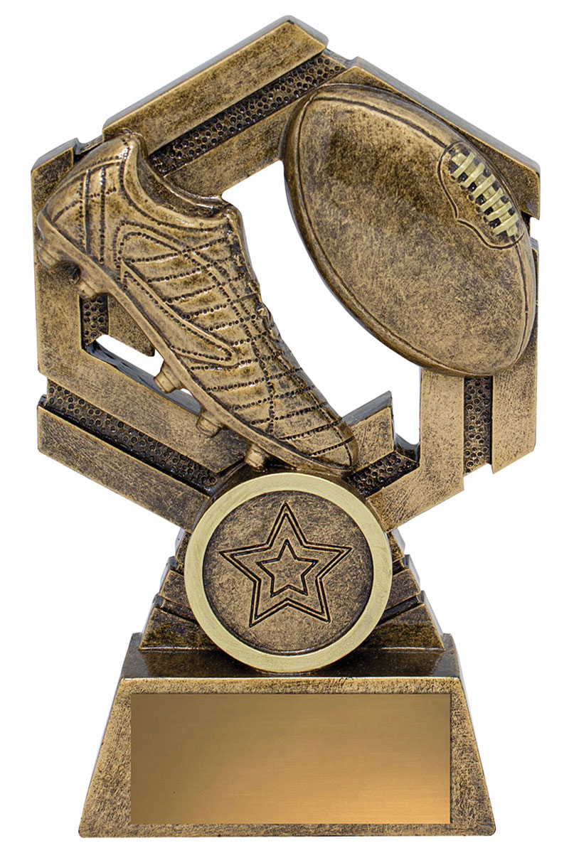 Eye-catching design that features classic Aussie Rules elements of boot and ball. Footy trophies finished in traditional antique gold. Available in 3 sizes with space for custom insert.