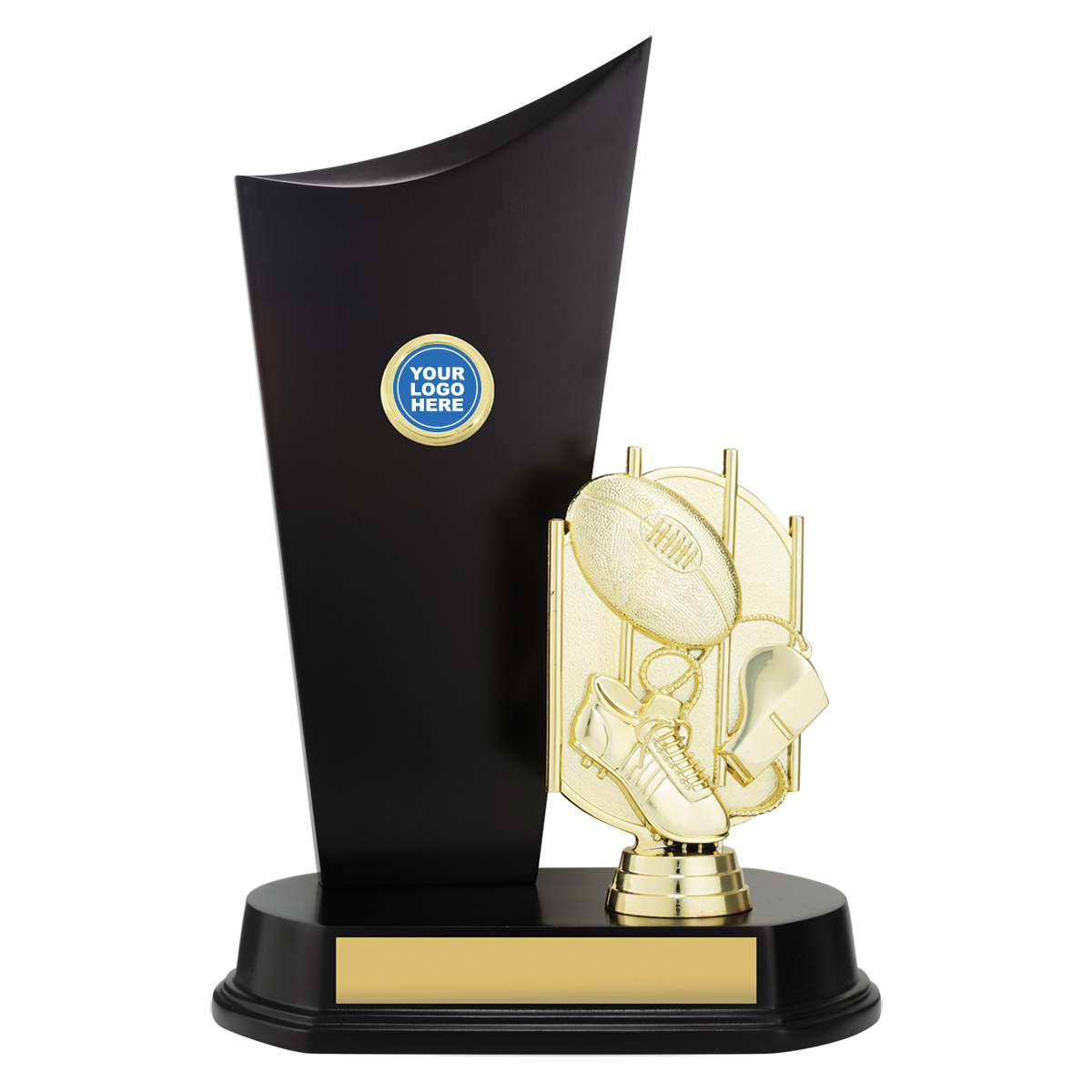 Striking series of timber wing based trophies - multiple sizes and space for your logo insert. Tops for all sports available.