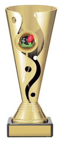 Carnival cups present a distinctive cup style trophy with attractive 3D design - on classic black marble base for your engraving - with brightly coloured insert for your sport. Trophies adaptable to your custom requirements.