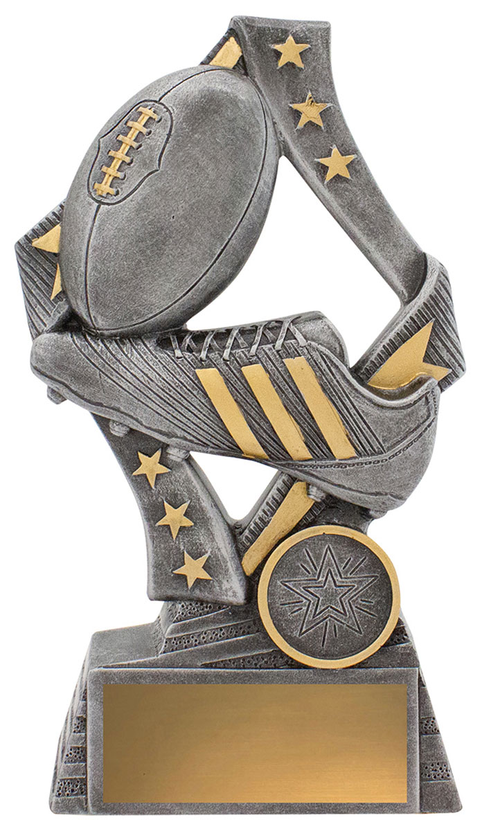 Dynamic footy trophies perfect for male and female players in your club. These 'Flag' aussie rules trophies feature a stylish star based design with iconic boot and ball elements.