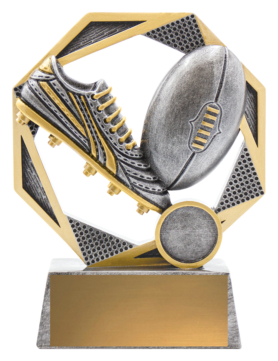 Elegant design of participation trophies for Aussie Rules feature iconic boot & ball elements and finished in classic antique silver.