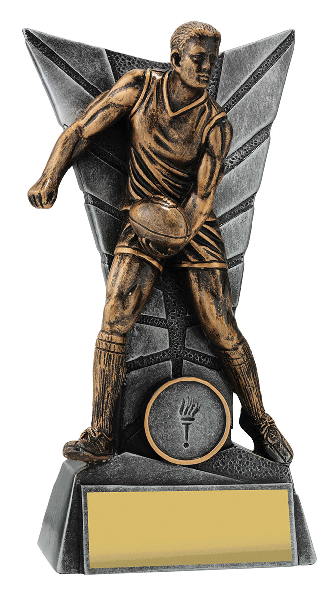 Elegant silver backdrop for this trophy series frames the detailed player captured in action. Footy trophies available in male and female and in multiple sizes to suit your award needs. Excellent choice for best player trophies for your team or club.
