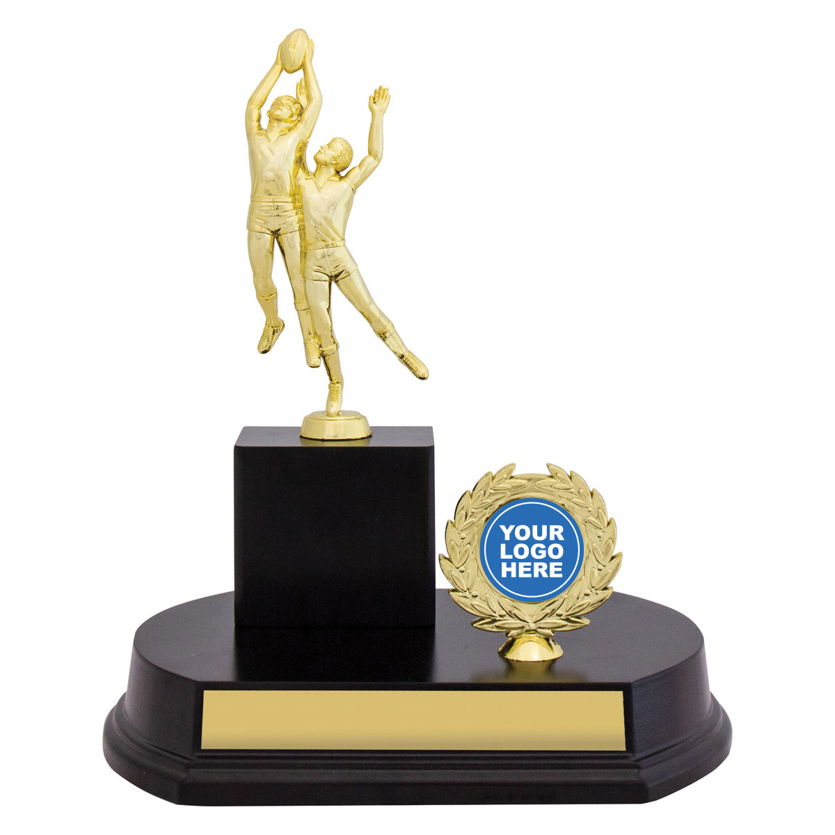 Distinctive design of timber trophy highlights the top for your sport and showcases your custom logo. Available in multiple sizes.