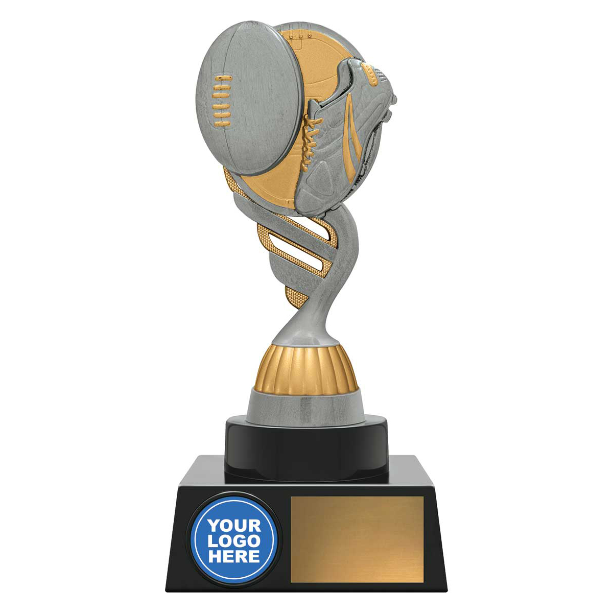 Aussie Rules trophy series in 3 sizes, a reliable option to award players and with a design finished in antique silver and gold. Base gives you the space for your club or team logo represented in the trophy.