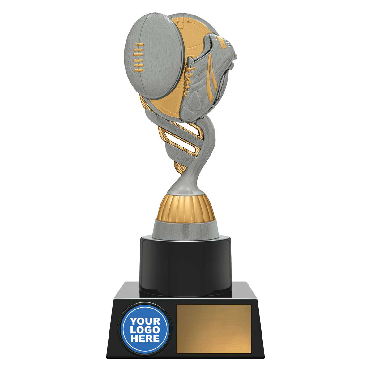 Aussie Rules trophy series in 3 sizes, a reliable option to award players and with a design finished in antique silver and gold. Base gives you the space for your club or team logo represented in the trophy.