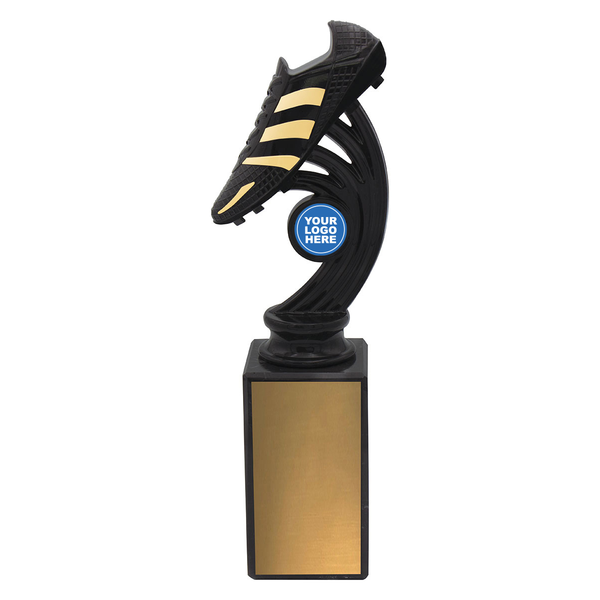 Inspired series of trophies featuring a realistic boot in motion and finished in an exciting black & gold combination. Suit your club logo - multiple sizes available.