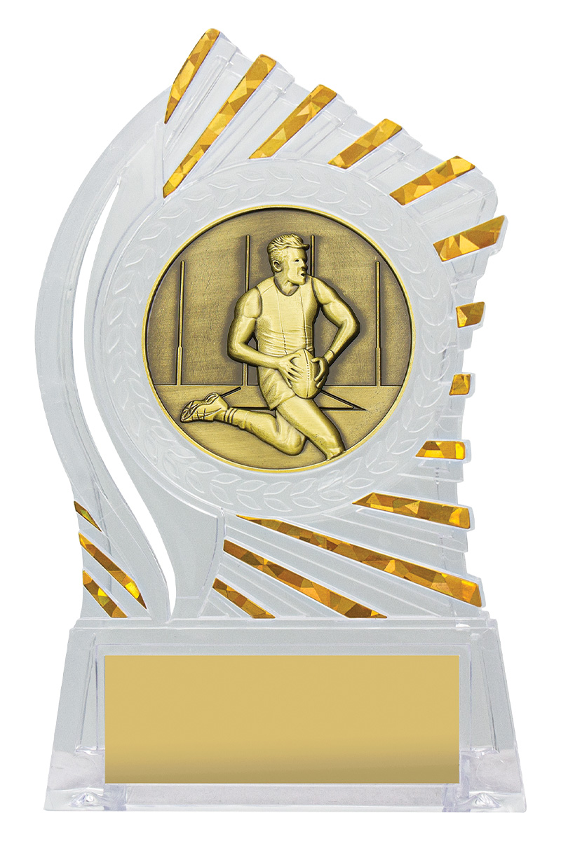 Exciting design of acrylic trophy showcases the gold theme for your sport or trophy. An affordable award with terrific space for your engraving.