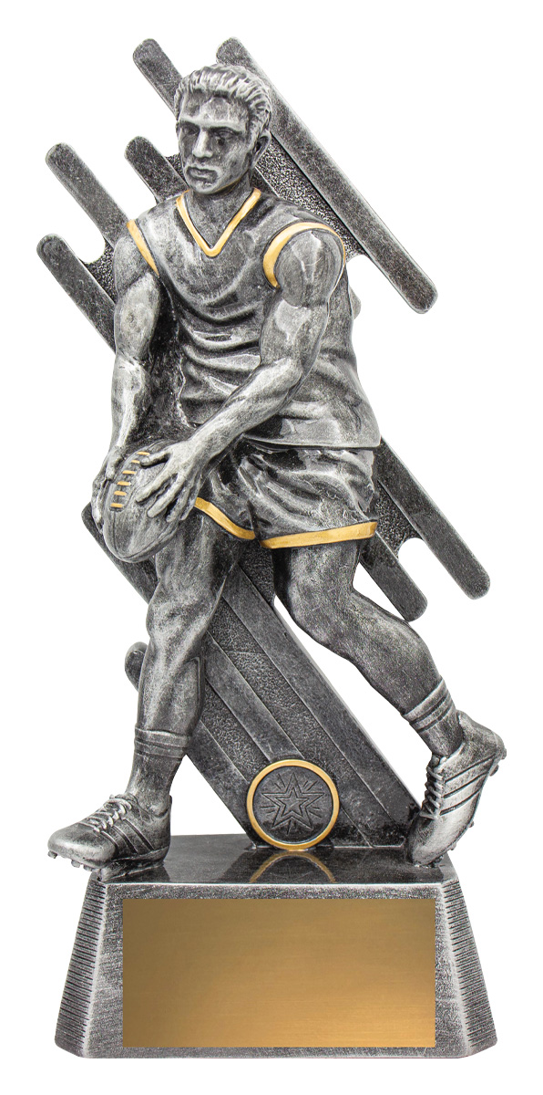 Zoom Series showcases Aussie Rules player in action against a stylised backdrop and finished in classic antique silver. Available in multiple sizes and includes space for custom logo.