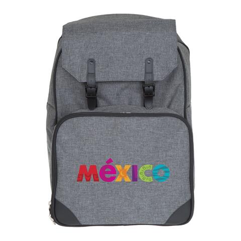 600D polyester 4-person picnic set including spoons, knives, forks, wine glasses, cotton napkins, and salt & pepper shakers. Features a PEVA-lined cooler compartment with a watertight removable inner lining, adjustable shoulder straps, and a carry handle. Finished with an “explorer” detailed front closure with magnetic buckle straps.