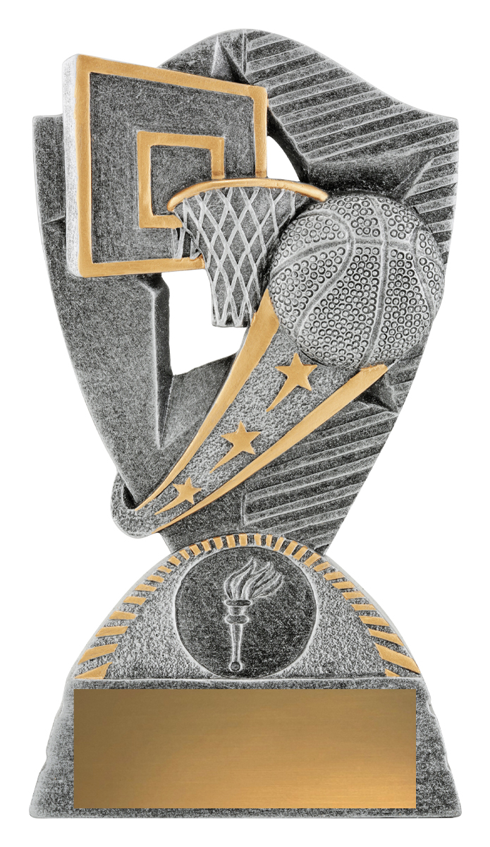 Brilliant basketball trophy for your team or club. The Gambit offers a dynamic theme in antique silver & gold - space for your custom logo.