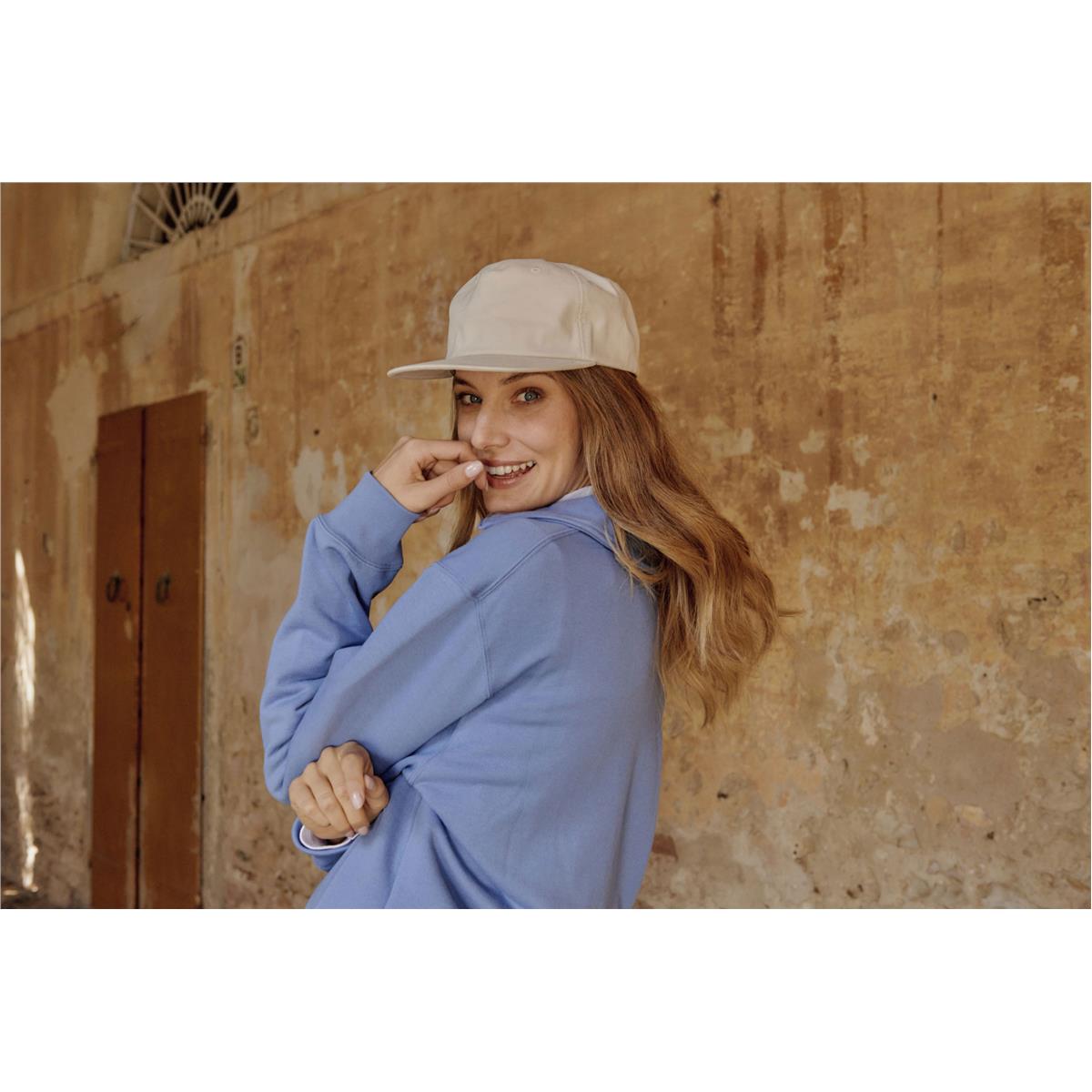 Unstructured, old-school cap made of a blend of recycled and organic cotton canvas. It features a flat visor and a recycled snapback closure.