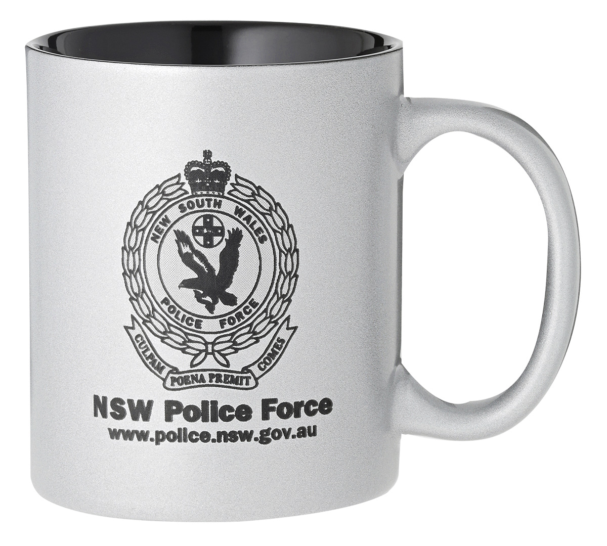 Silver ceramic coffee mug perfect for laser engraving for your text and logo requirements. Standard 325ml design. Silver outer coating and black engraving. A brilliant alternative for an award or trophy for your company or organisation.