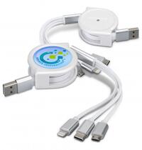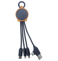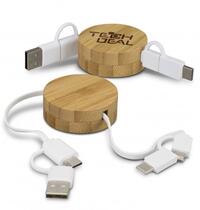 A handy mobile charging cable key ring for phones, tablets, cameras, GPS etc. It offers three different connectors in one compact bamboo unit, a USB, Type-C, and a Lightening that can be flipped over to be a Micro-B. This device is for charging only and is not designed for data connections. Bamboo is a natural material and because the plant is fast growing, it places less demands on natural resources and produces a material that is durable and versatile. Bamboo can also produce unavoidable variances in the grain pattern, colour and branding. It laser engraves to a natural etch.