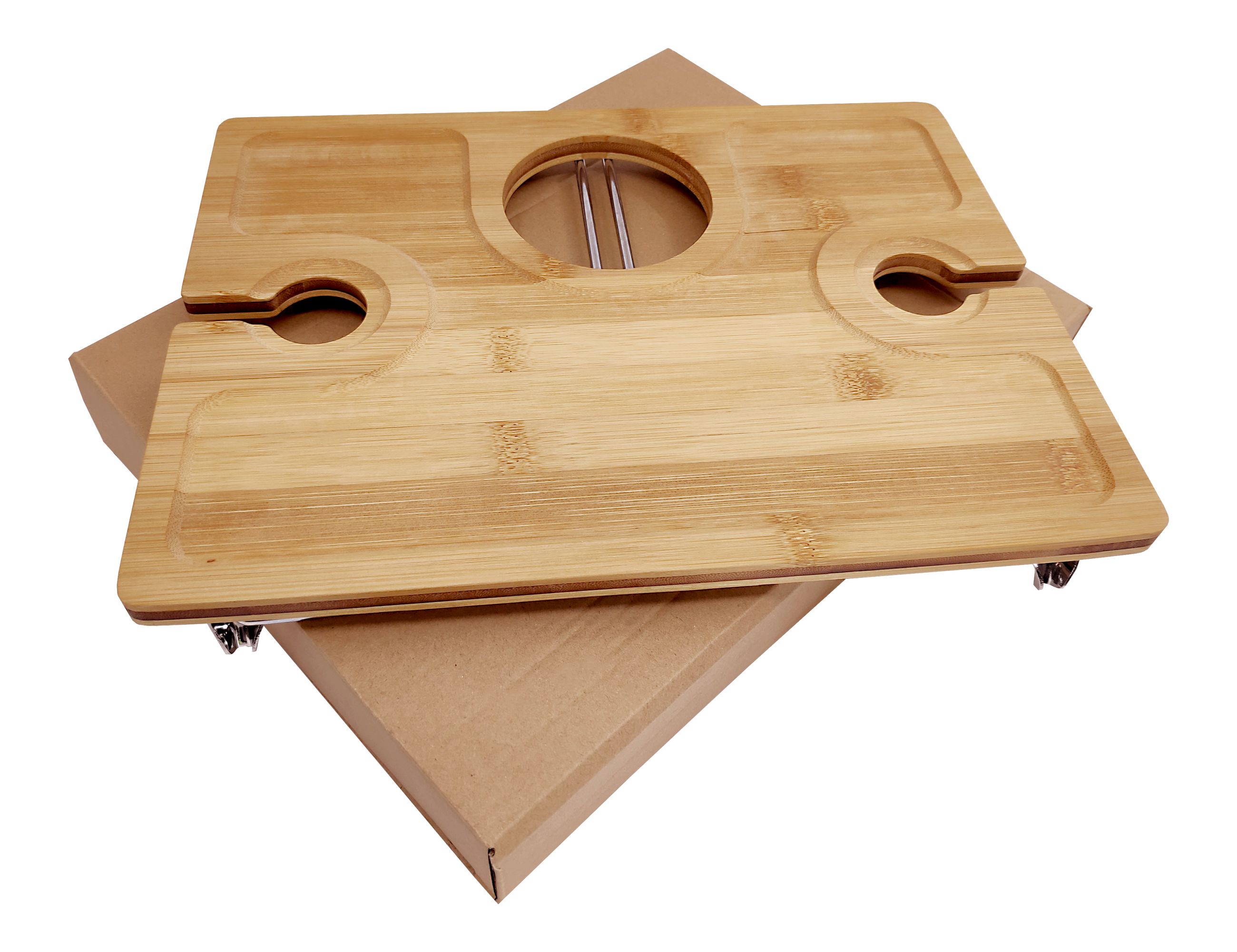 As the name suggests, Picnic For Two is the perfect companion for sunny days in the park, on the beach or when you’re out and about. This ingenious cheese and wine table is designed to hold two wine glasses and a wine bottle in place, together with a selection of cheese and accompaniments. This cheese board features our unique folding design and is crafted from ‘eco-friendly’ bamboo and is supplied laser engraved with your logo and presented in a natural coloured gift box. Because of the unique nature of bamboo, the product and engraving colour may vary from item to item. As this product is hand crafted, each Picnic For Two may differ slightly in shape and size.