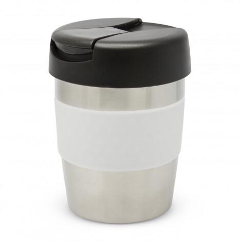 Premium 230ml double wall, vacuum insulated stainless steel cup which will keep drinks hot for up to three hours. It has a soft-touch silicone band and a secure screw on lid with a splashproof flip closure. The cup, lid and band can be mixed and matched in any colour combination from the standard colours at no extra cost. Up to five different colour combinations are included in the price and more are available for an additional charge. Java is BPA-free and is presented in a black gift box. An optional gift tube is available on request. This product is not dishwasher safe and handwashing is recommended.