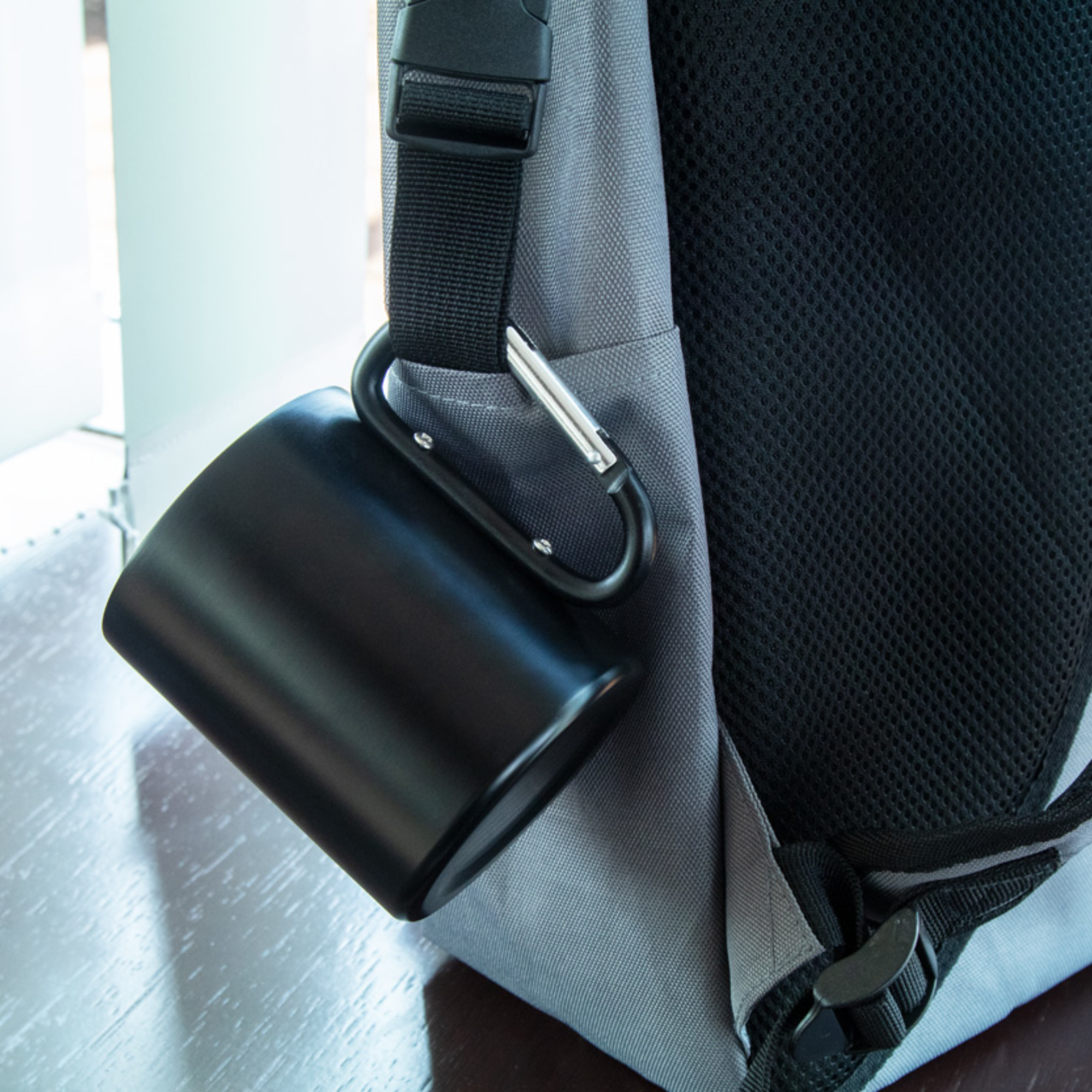 The Tunis Thermo Mug is designed for convenience and sustainability, offering a 300ml capacity in a compact, travel-friendly size. Made from double-wall recycled stainless steel, it keeps drinks hot or cold for longer while reducing environmental impact. Its unique matching colour carabiner handle, crafted from recycled aluminium, doubles as a clip for attaching to backpacks or gear, making it ideal for outdoor activities, commuting, or daily use. Presented in a natural kraft paper box for a sustainable finish.