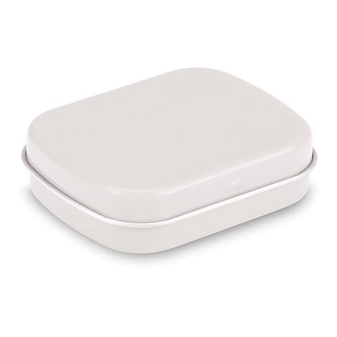 Food grade metal rectangular mint tin filled with sugar free breath freshener mints(approximately 170pcs) and full ingredient and nutritional information is printed on the back of the tin. Sealed with plastic wrapping on the side.