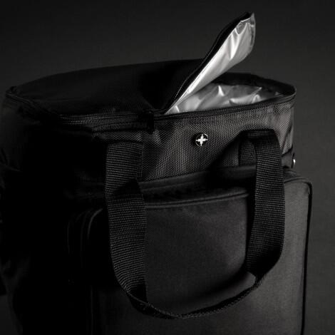 Deluxe 16L Swiss Peak Cooler Bag with thick PE foam insulation encased in a water-resistant PEVA inner liner. The outer construction features a stylish combination of 1680D and 600D polyester. It has strong woven carry handles with a Velcro cuff as well as an adjustable and removable woven shoulder strap with a shoulder pad. Other features include a large zippered top closure, a zippered pocket on the front and slip pockets on both sides.