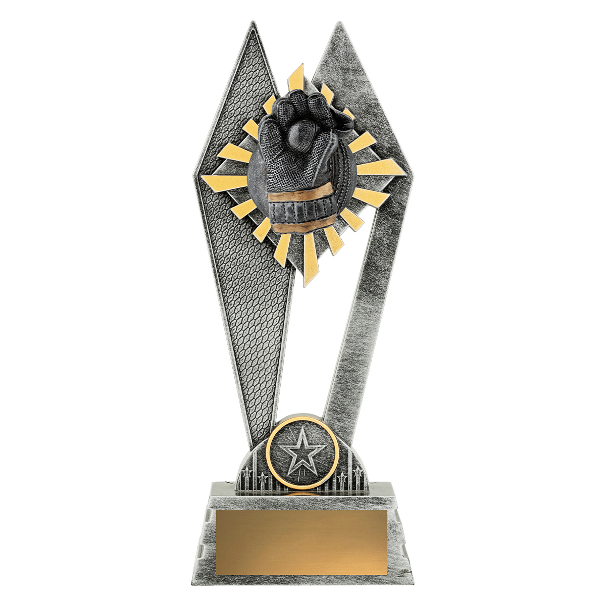The Peak Series - for Cricket - is an innovative trophy series offering super value for such an impressive size range. An elevated design that showcases a brilliant wicketkeeper theme against a vibrant sunray style background.