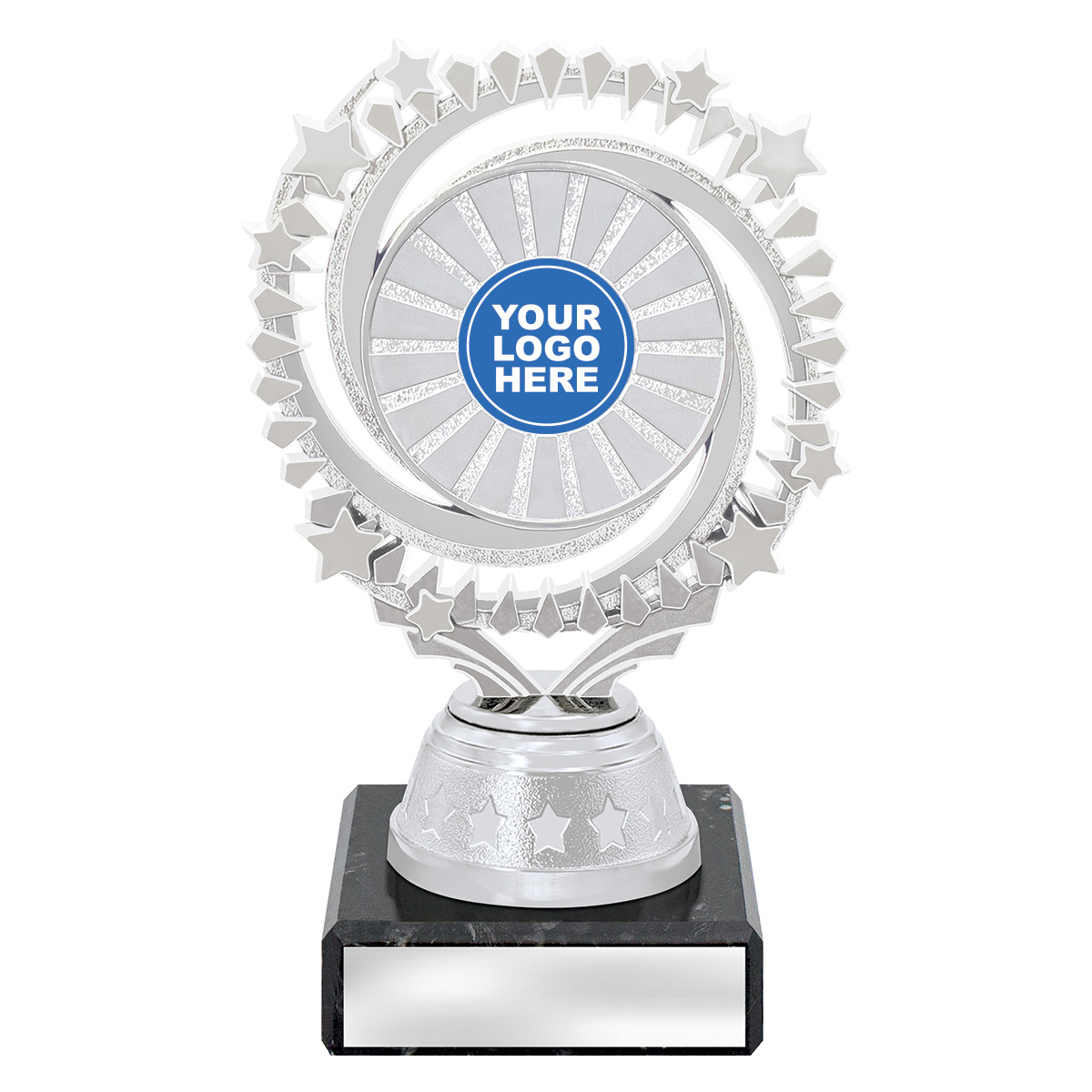 Cosmic series of affordable trophies feature star spangled holder in gold or silver - choose colour of column to suit your order. Suit 25 or 50mm centre insert.