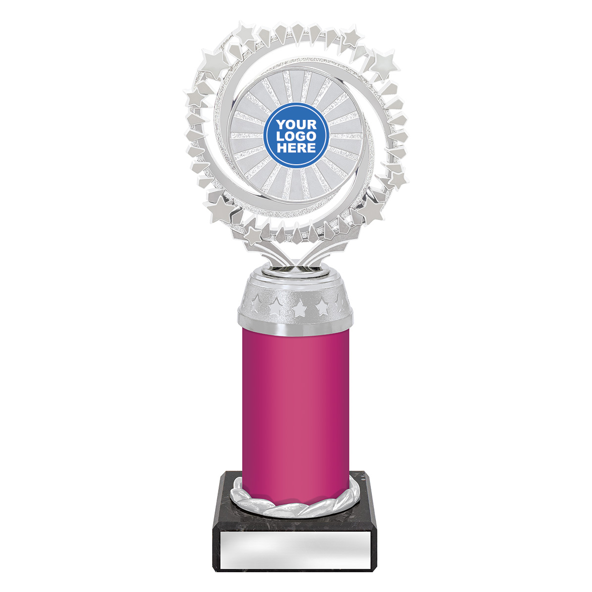 Cosmic series of affordable trophies feature star spangled holder in gold or silver - choose colour of column to suit your order. Suit 25 or 50mm centre insert.