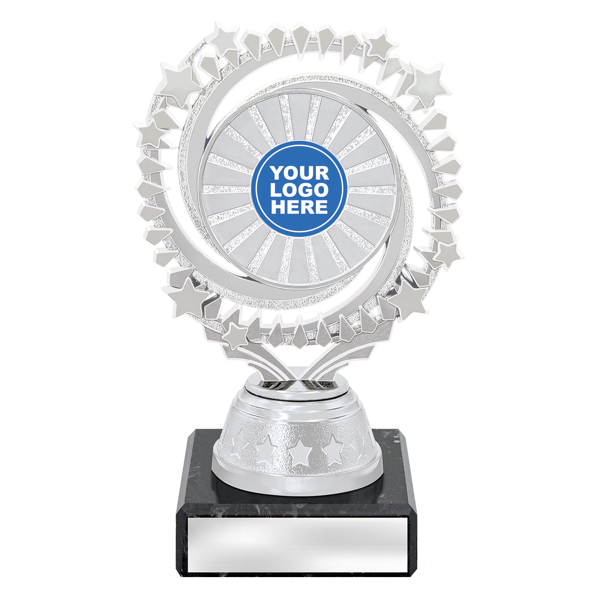 Cosmic series of affordable trophies feature star spangled holder in gold or silver - choose colour of column to suit your order. Suit 25 or 50mm centre insert.