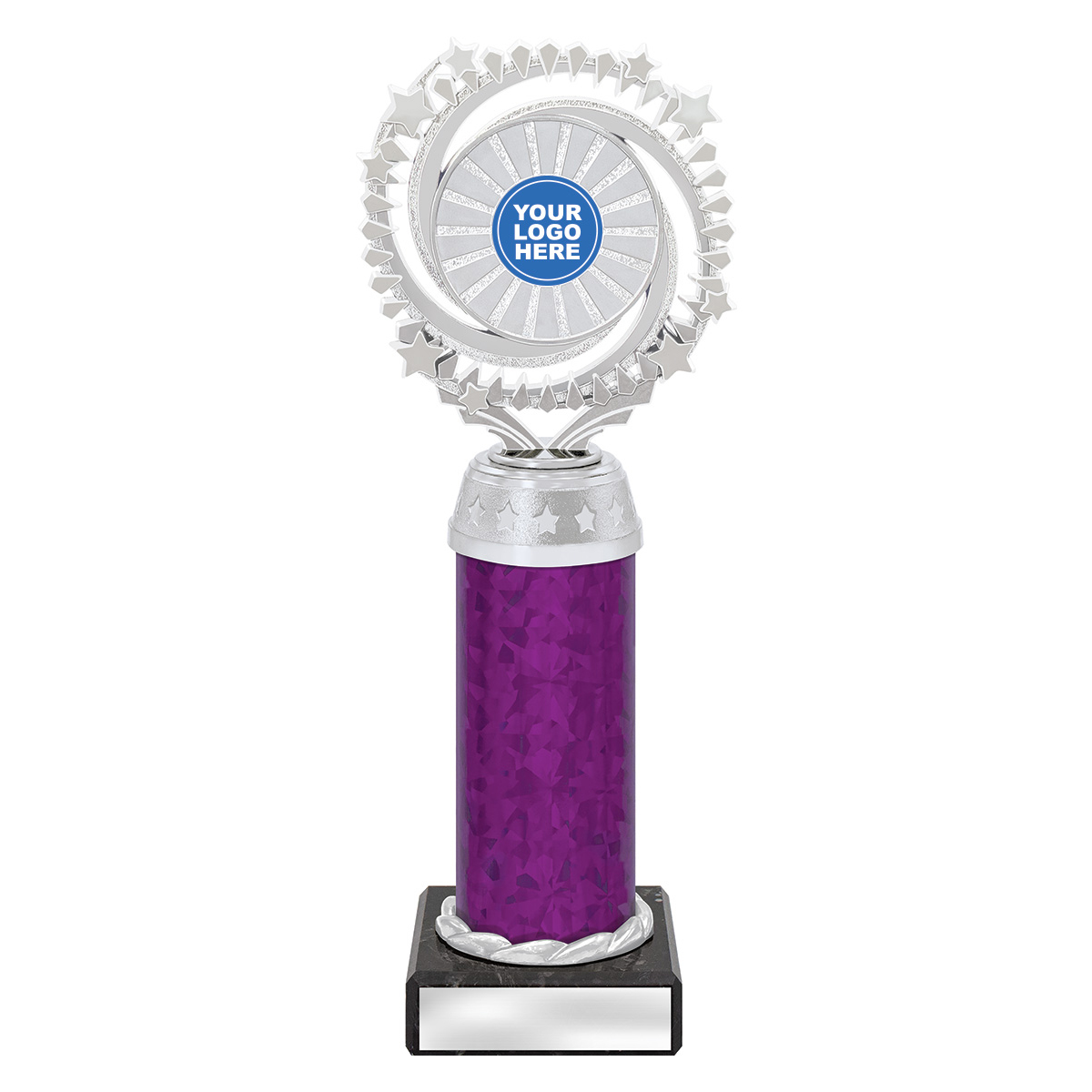 Cosmic series of affordable trophies feature star spangled holder in gold or silver - choose colour of column to suit your order. Suit 25 or 50mm centre insert.
