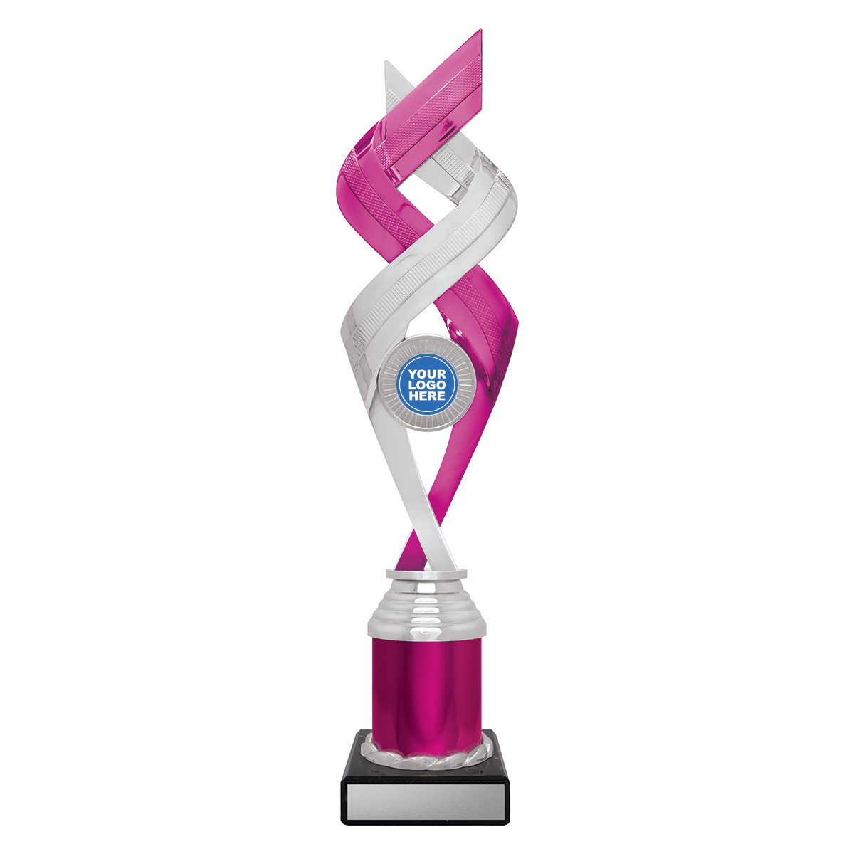 Stylish Jetstream series of holder trophies feature a complex design of intertwining elements and a central spot for your custom logo. Available in different colours.