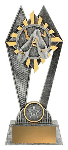 Peak style trophies - for Ballet - offer fantastic value for bigger series of trophies available in 3 sizes. Design showcases key elements for Ballet against vibrant sunray background. Trophies finished in classic antique silver and gold highlights.