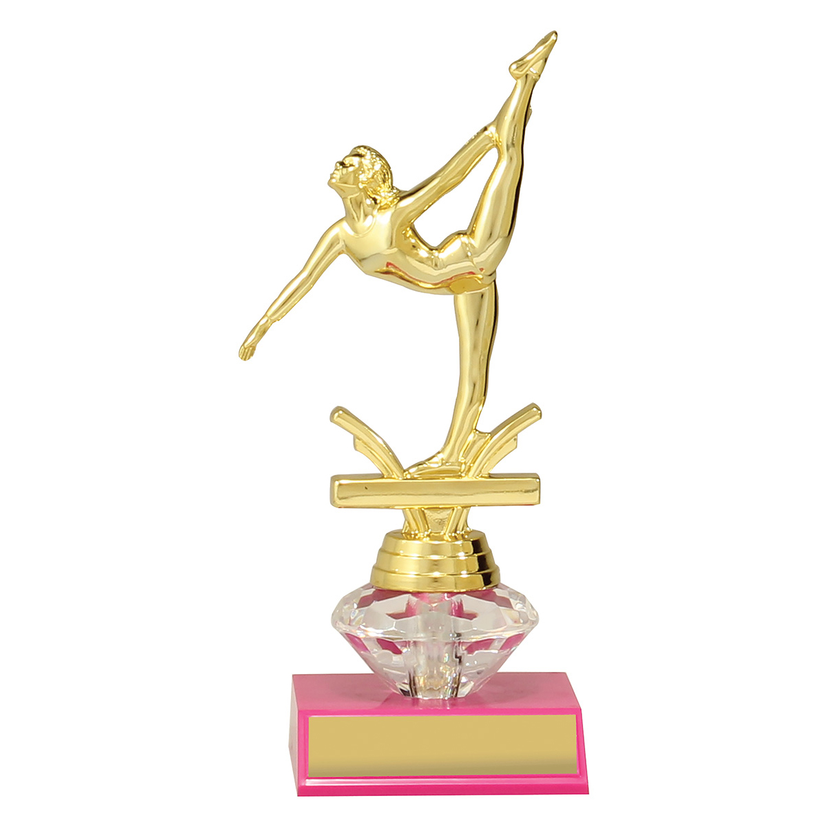 Stylish 'diamond' trophies ideal for dance and performing arts. With pink base and diamond riser, trophies are finished with bright gold dance figure.