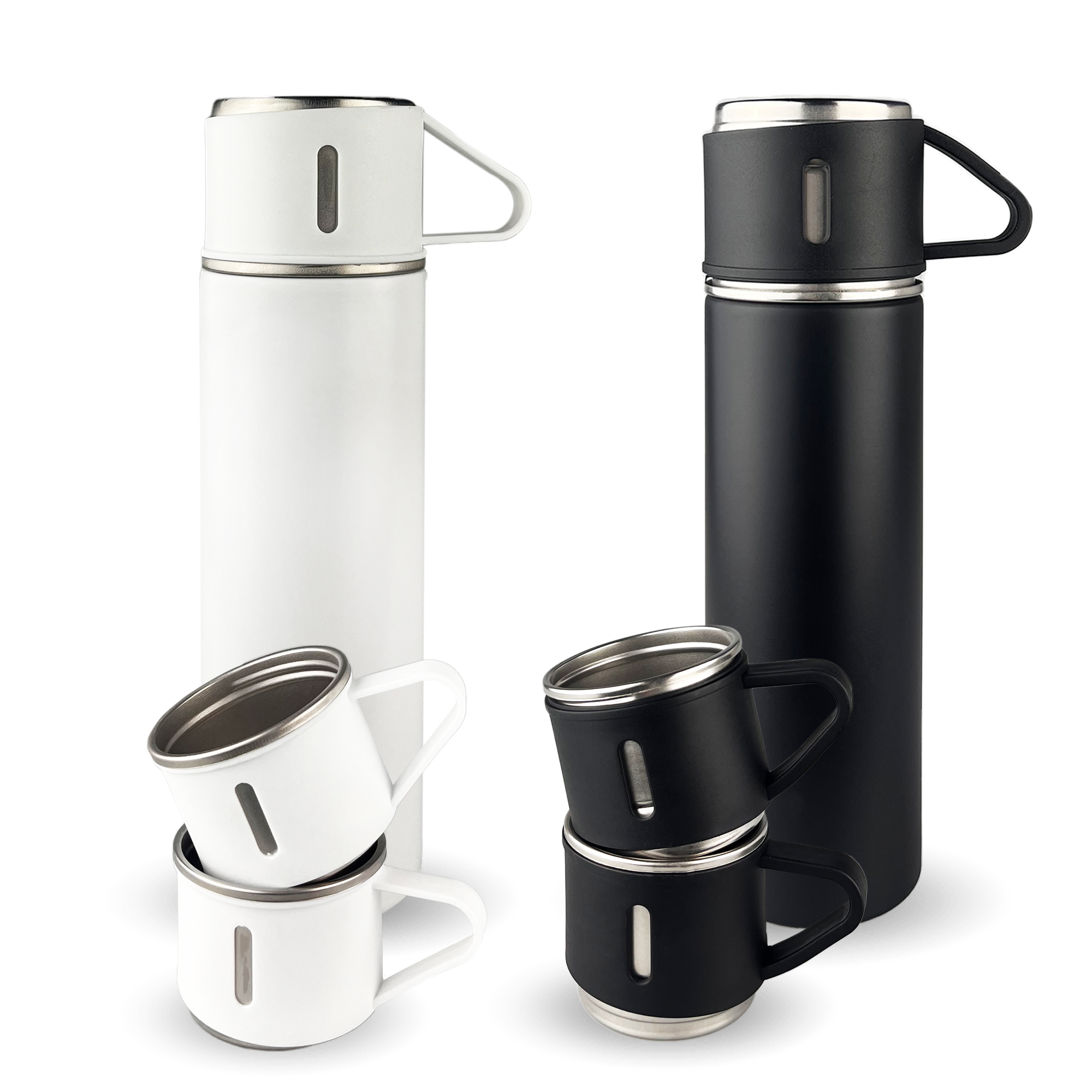 Double walled vacuum insulated technology keeps beverages hot for up to 12 hours or cold for up to 24 hours. Made of 304 stainless steel inner coating for better temperature retention. A unique matt finishing 500ml flask that makes pouring completely hassle-free spill-free and rust-proof. A push button operation with no condensation on the outer body even while carrying icy cold water completely sweat-free. Leak proof design. Contains no toxins. Completely BPA and phthalate-free. Three small cups made of stainless steel with plastic handle and outer. All packed into a smooth semi-gloss black cardboard box with a die-cut foam base to hold bottle and mugs. Not dishwasher safe handwashing is recommended.