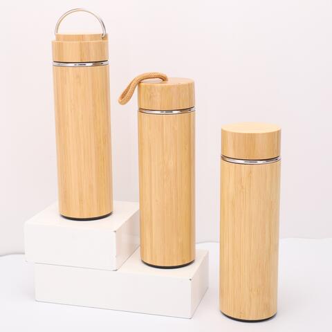 Elegant slim design 450ml stainless steel vacuum double wall drink bottle with filter featuring an eco-friendly sustainably sourced natural bamboo outer wall. It has an option of 3 type of lids: no handle rope handle and steel wire handle. It is leak-proof and can keep hot for at least 4hrs - 8hrs and cold for 24hrs. The inner wall is 304 food grade stainless steel and 100% BPA free. It is not dishwasher and microwave safe handwashing is recommended. Do not place dry ice carbonated drinks etc. The natural bamboo does produce variances in colour grain pattern and branding. This bottle is small enough to carry around they can fit into totes bag packs and most car cup holders it has large capacity suitable for carrying a variety of coffee hot water and ice water to meet your daily drinking needs is a great promotional product to display your logo and get your message across.