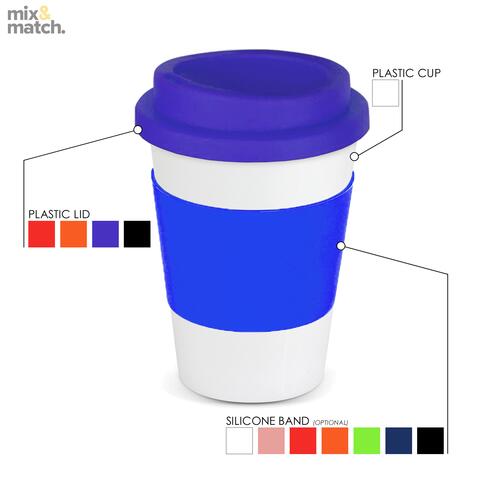 High quality 354ml BPA free reusable double wall plastic ecco cup strong and durable shiny white cup with satin finishing screw on lid which is leak tight this product is dishwasher and microwave safe. Optional selective 7 colours of silicon band. Note the silicone band is not recyclable material.