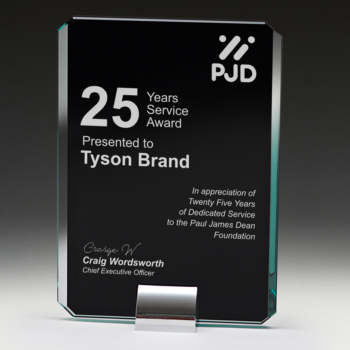 Outstanding glass awards with patented black panels allow for precise engraving to your requirements. Design is elevated by the shiny metal bases. In gift boxes.